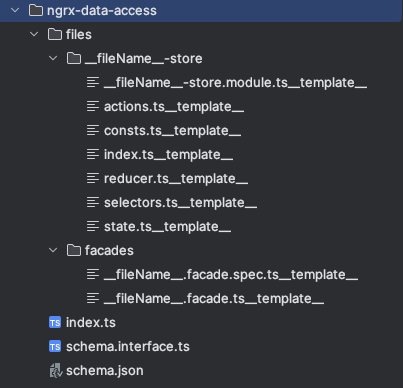 From the folder structure above, a fileName injects into the template. For instance, the collectionName supplied to the generate was member, the two files above that would be generated with a unique name would be member.model.ts and member-store.module.ts. A unique directory also would be created member-store containing all the files listed underneath.